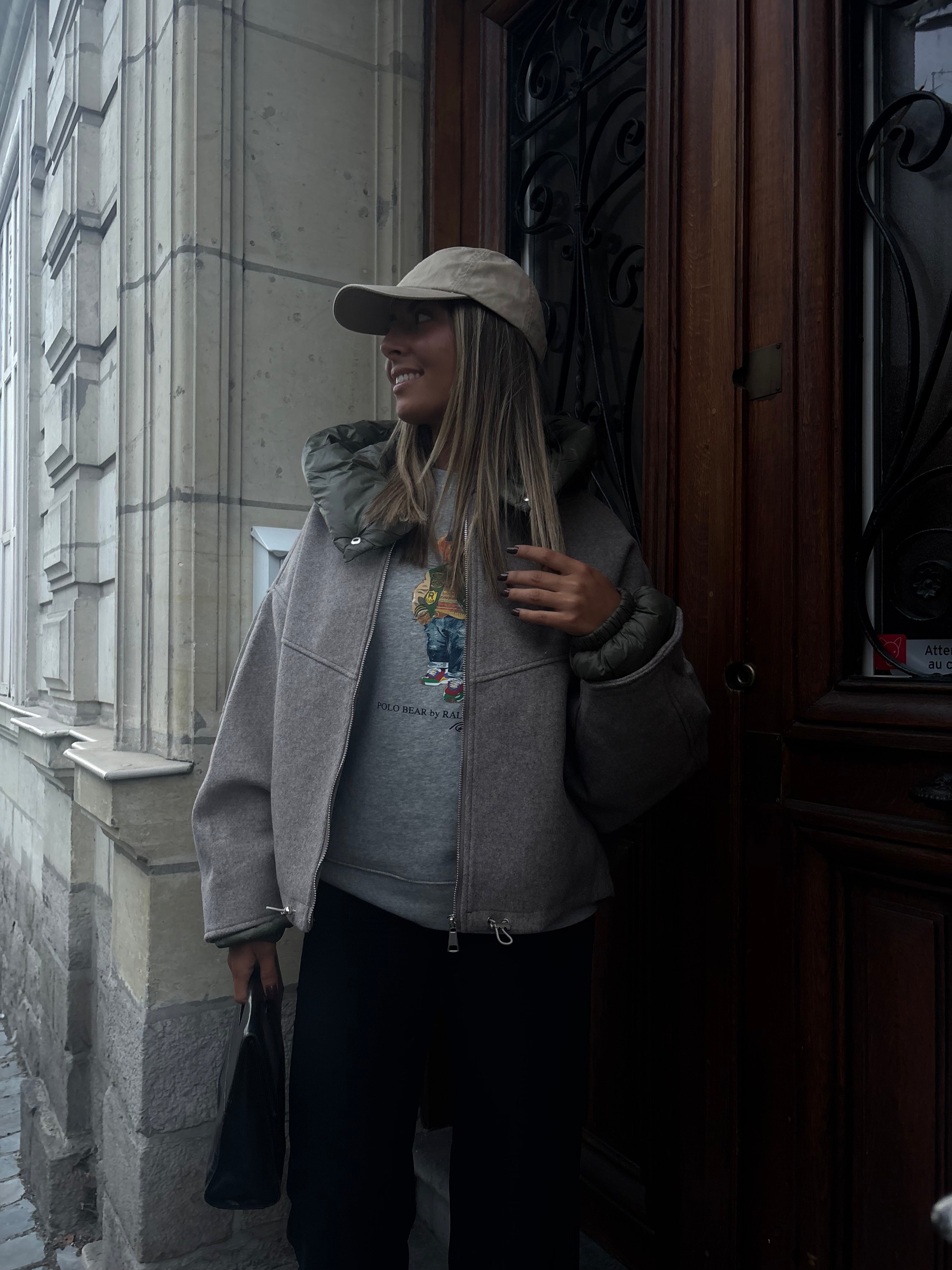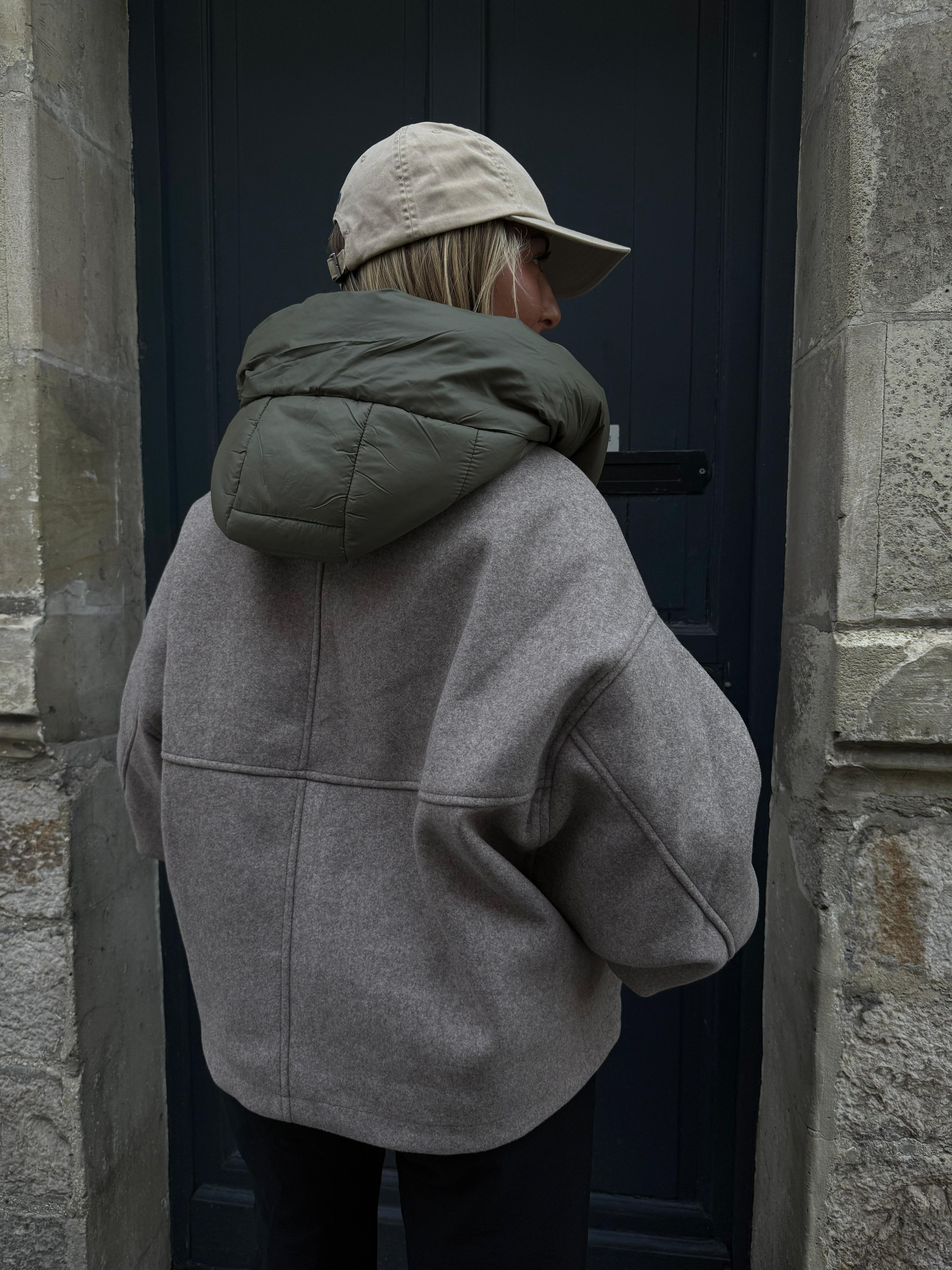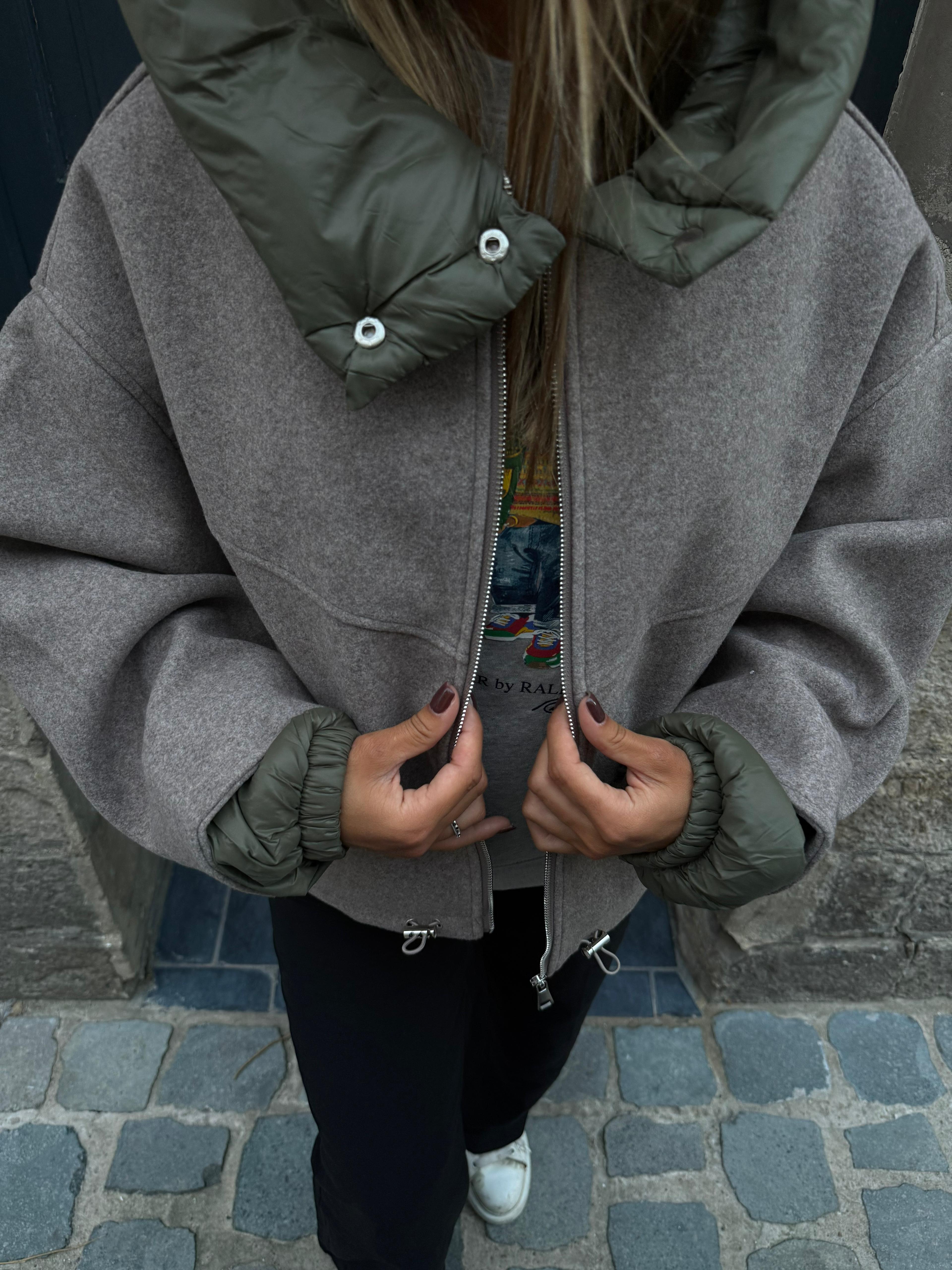 Blouson Valentina couleur taupe avec capuche et manches kaki. Composition : 100% polyester. Je porte du SM