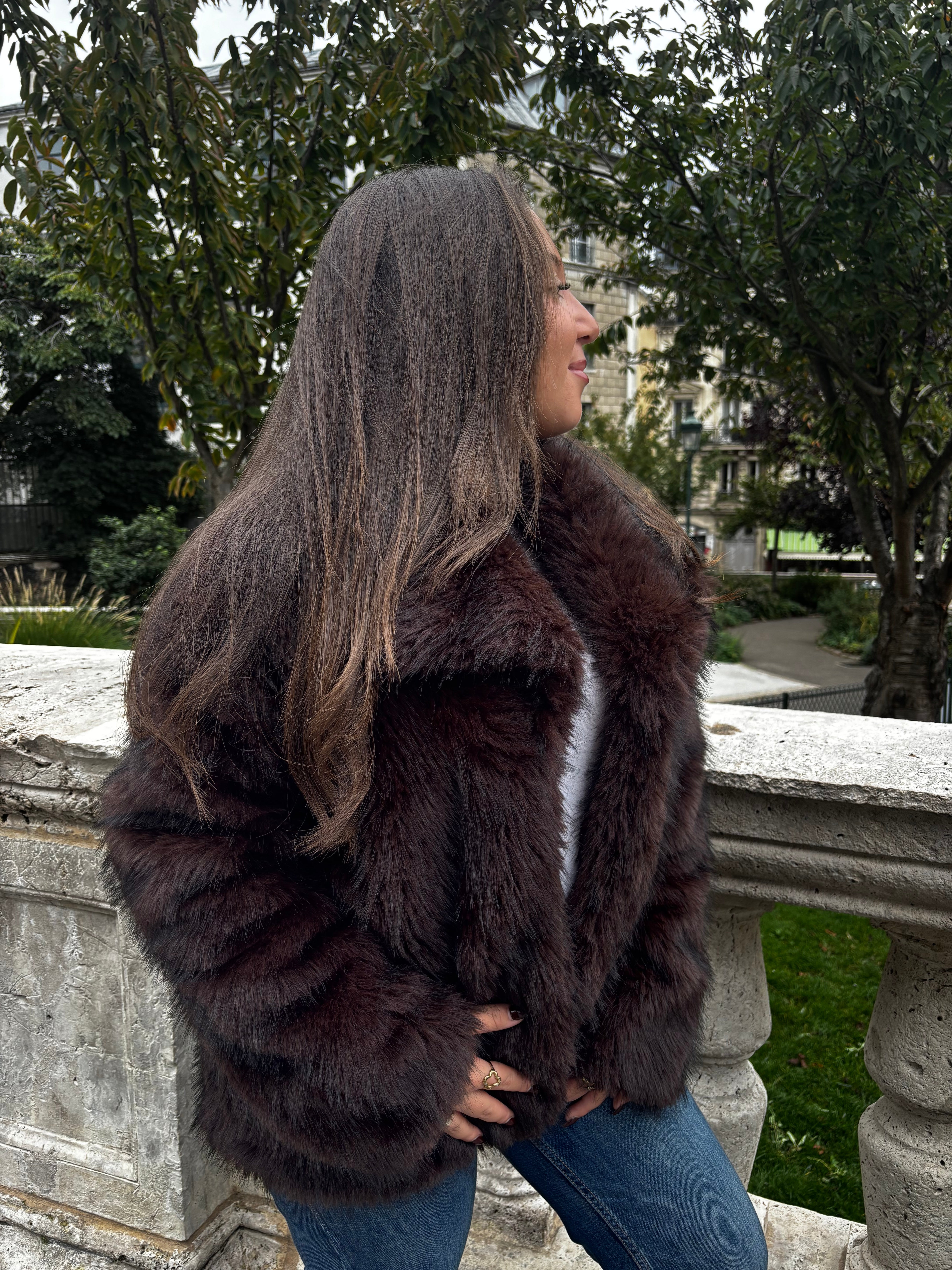Fourrure marron châtain Manches longues amples, avec un petit col. 100%polyester Personnellement, je porte du S