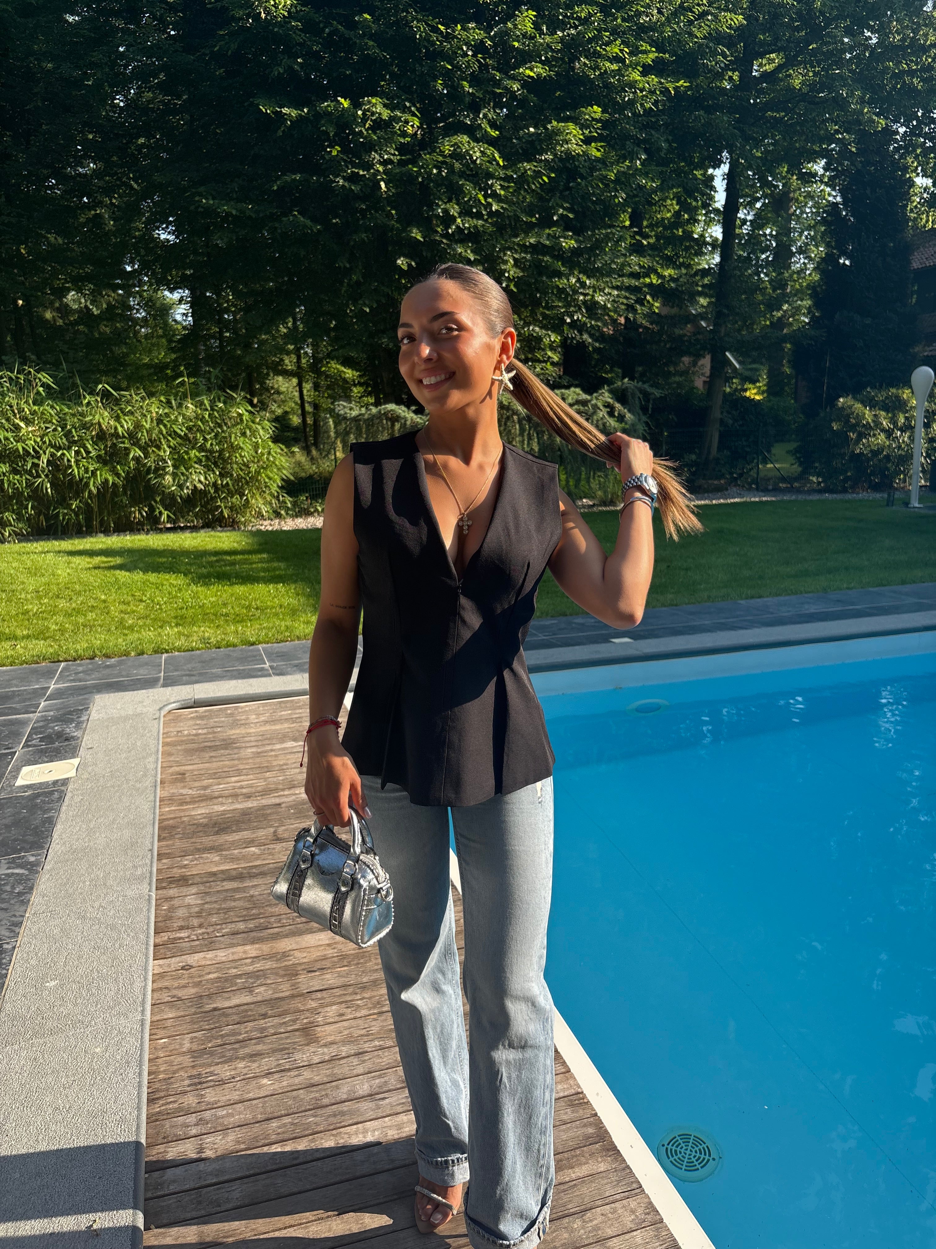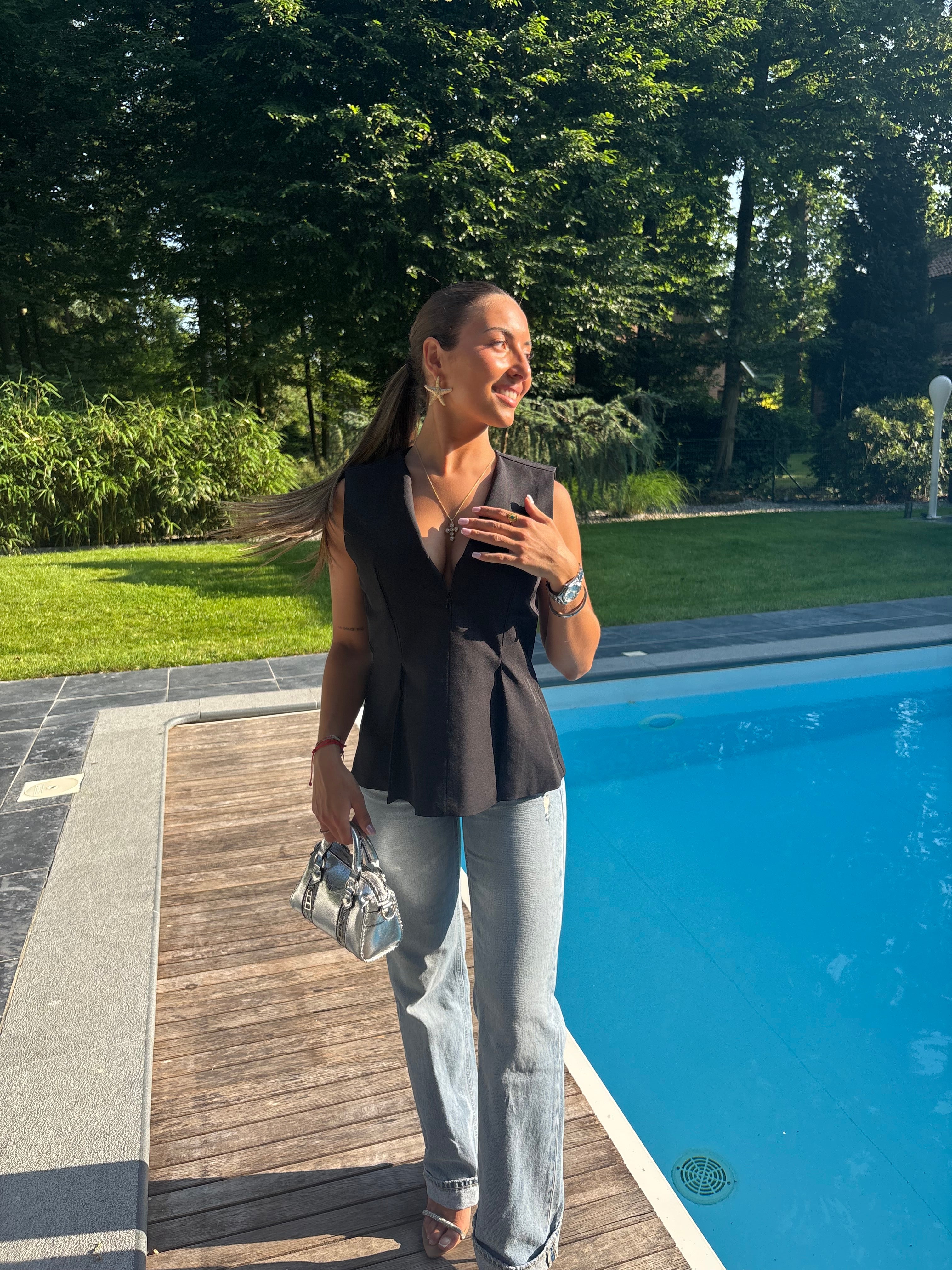 Haut Sofia, possède un joli col accompagné de petits plis sur les côtés qui marquent délicatement la taille. Sa fermeture réglable...
