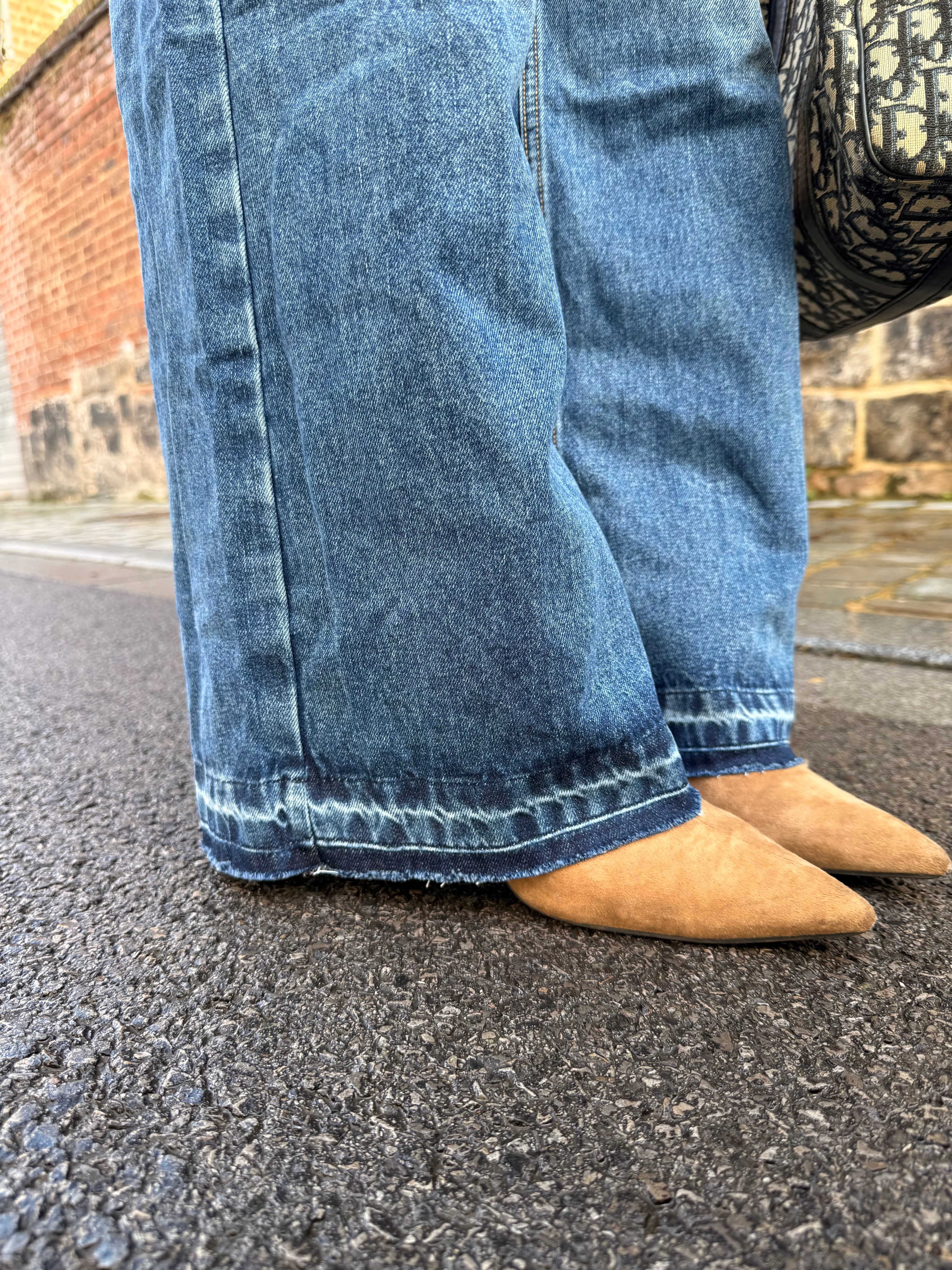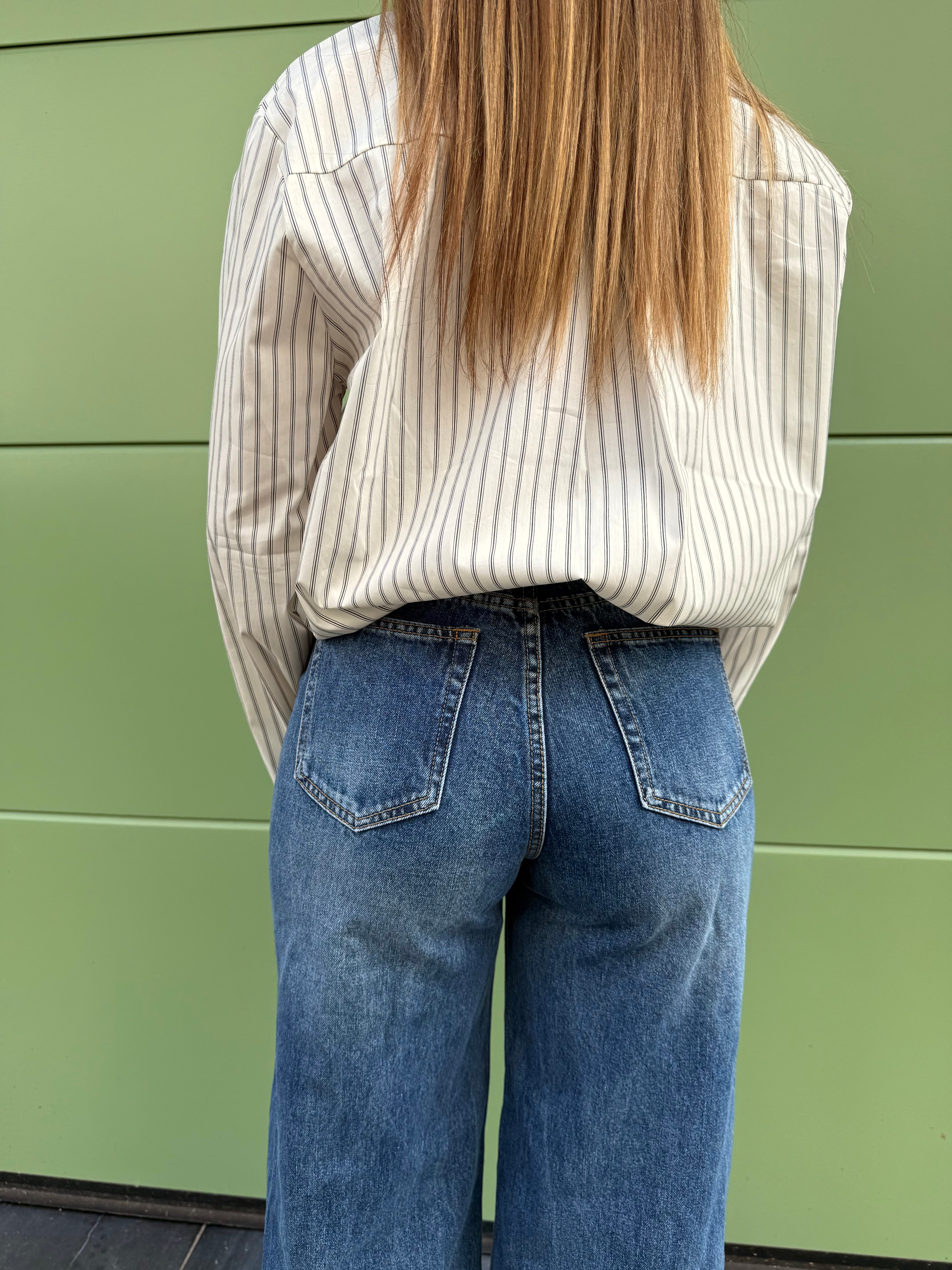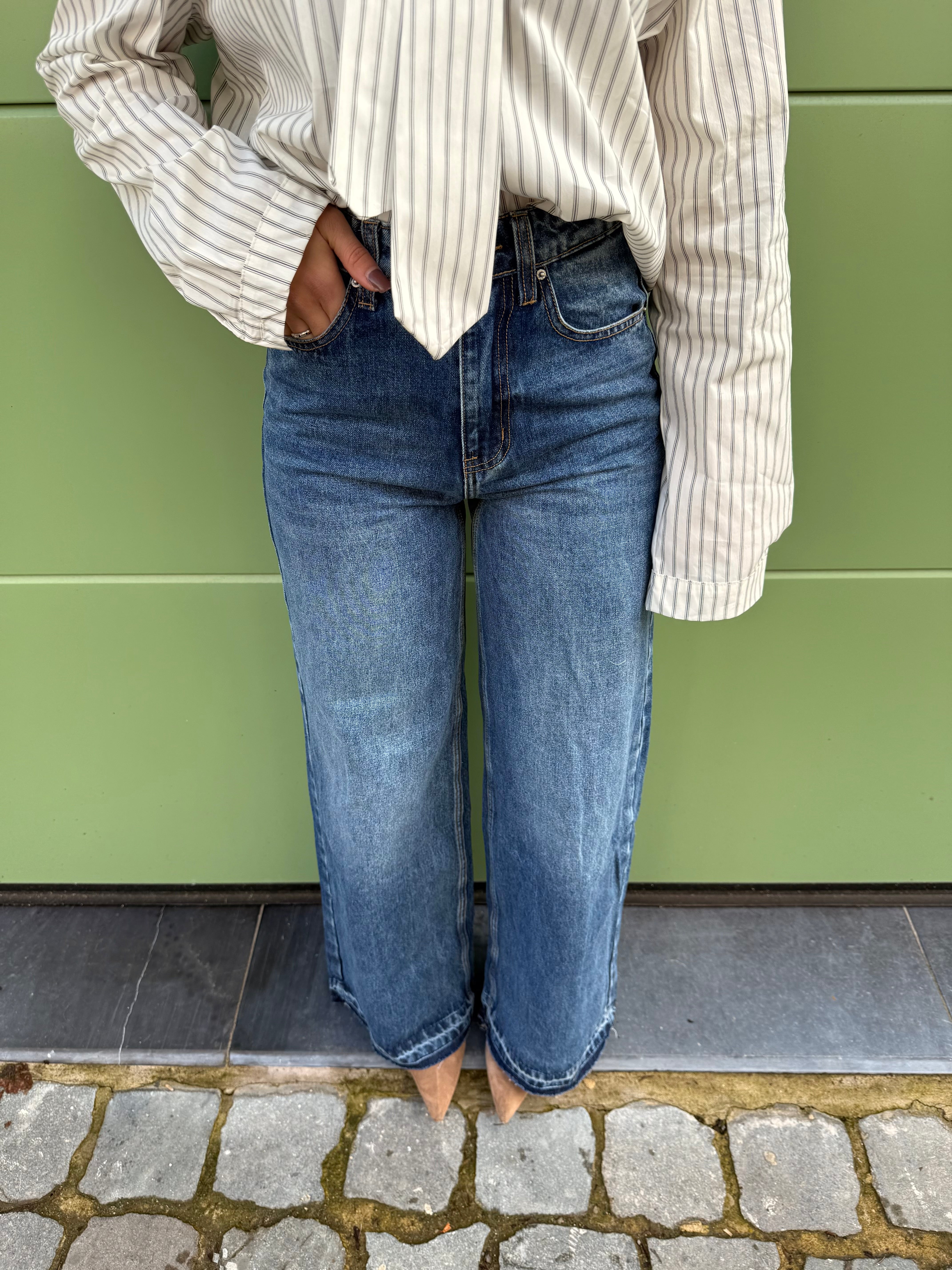Jean Marie Jean en denim à taille haute avec ceinture montée et passants. Coupe large droite sur toute la jambe....