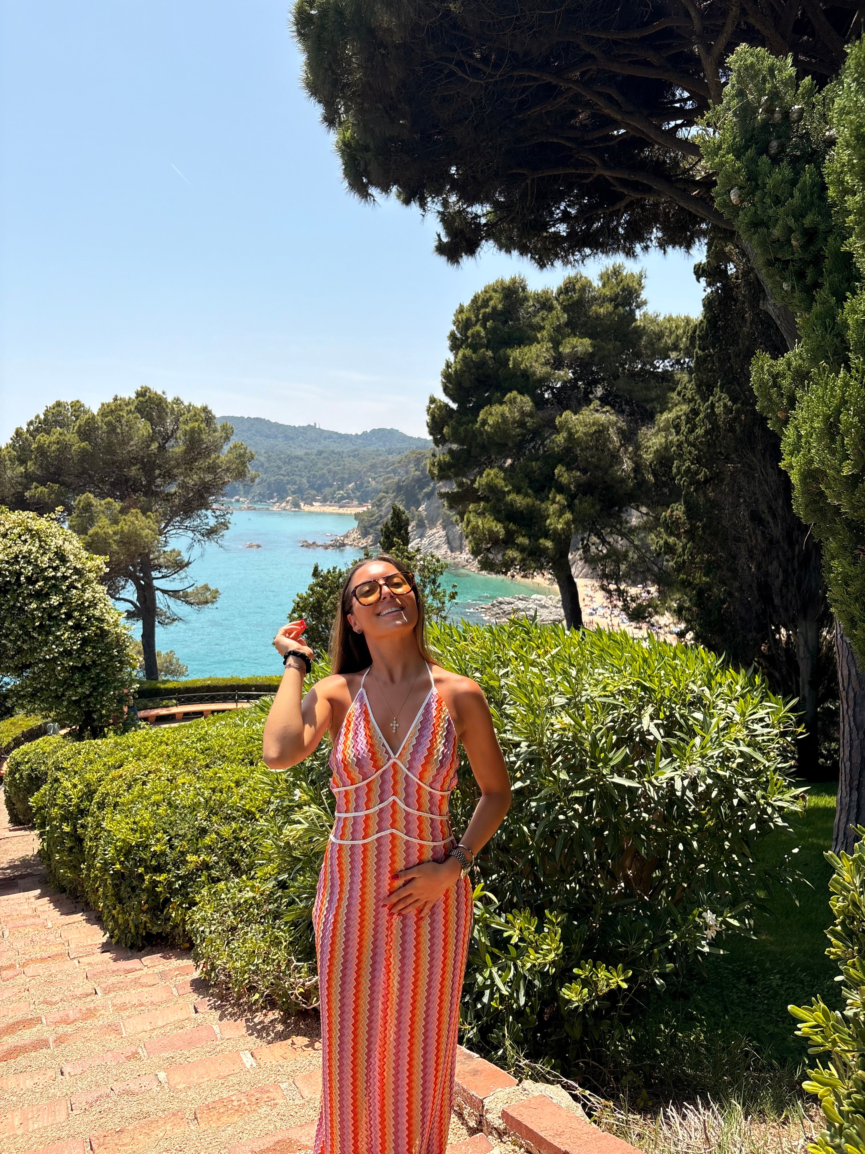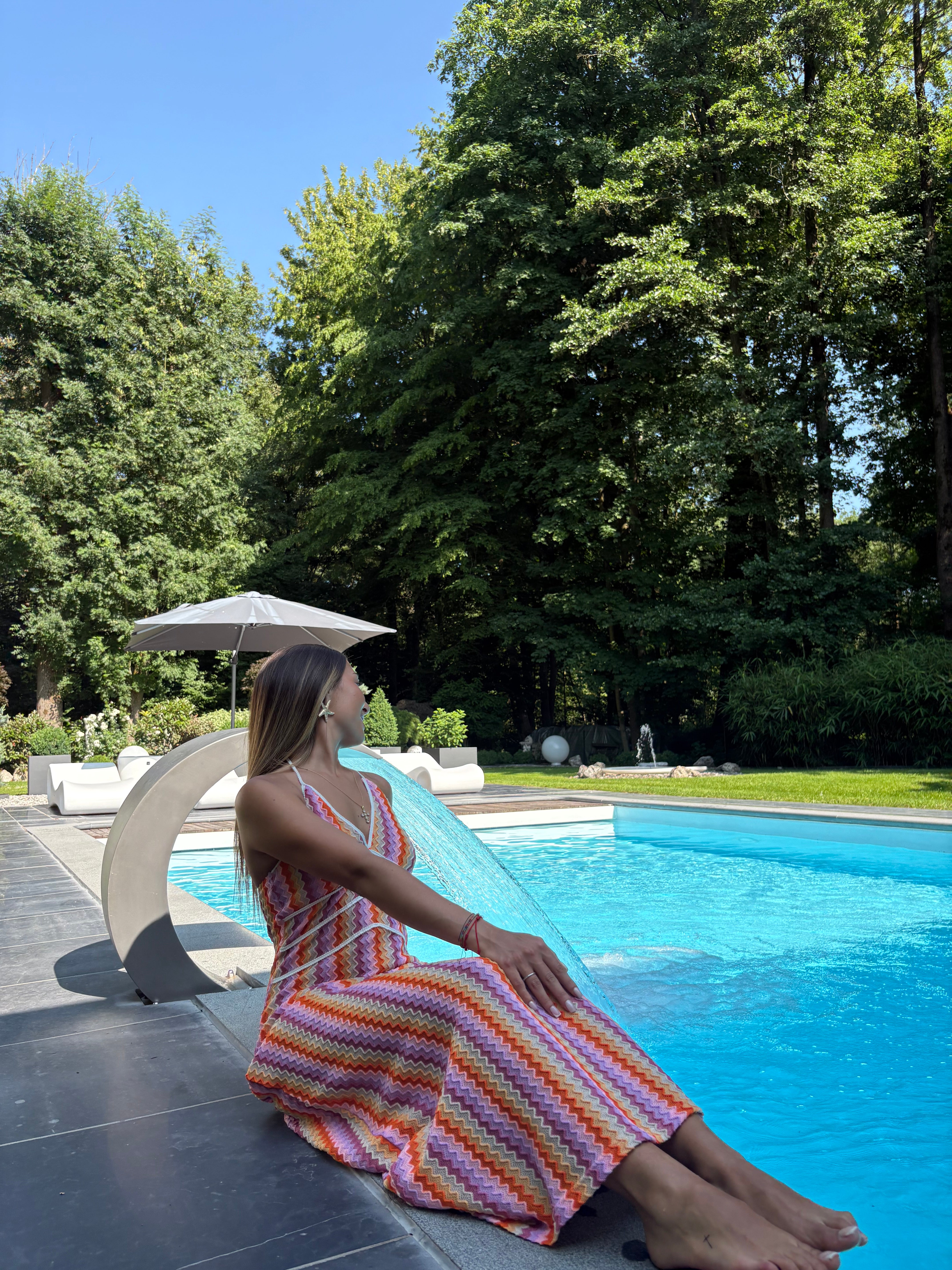Robe Estate  longue aux tons chauds: rose, orange, jaune et blanc, avec un motif zigzag. Coupe fluide et estivale, parfaite pour une journée au bord de la piscine ou en vacances.