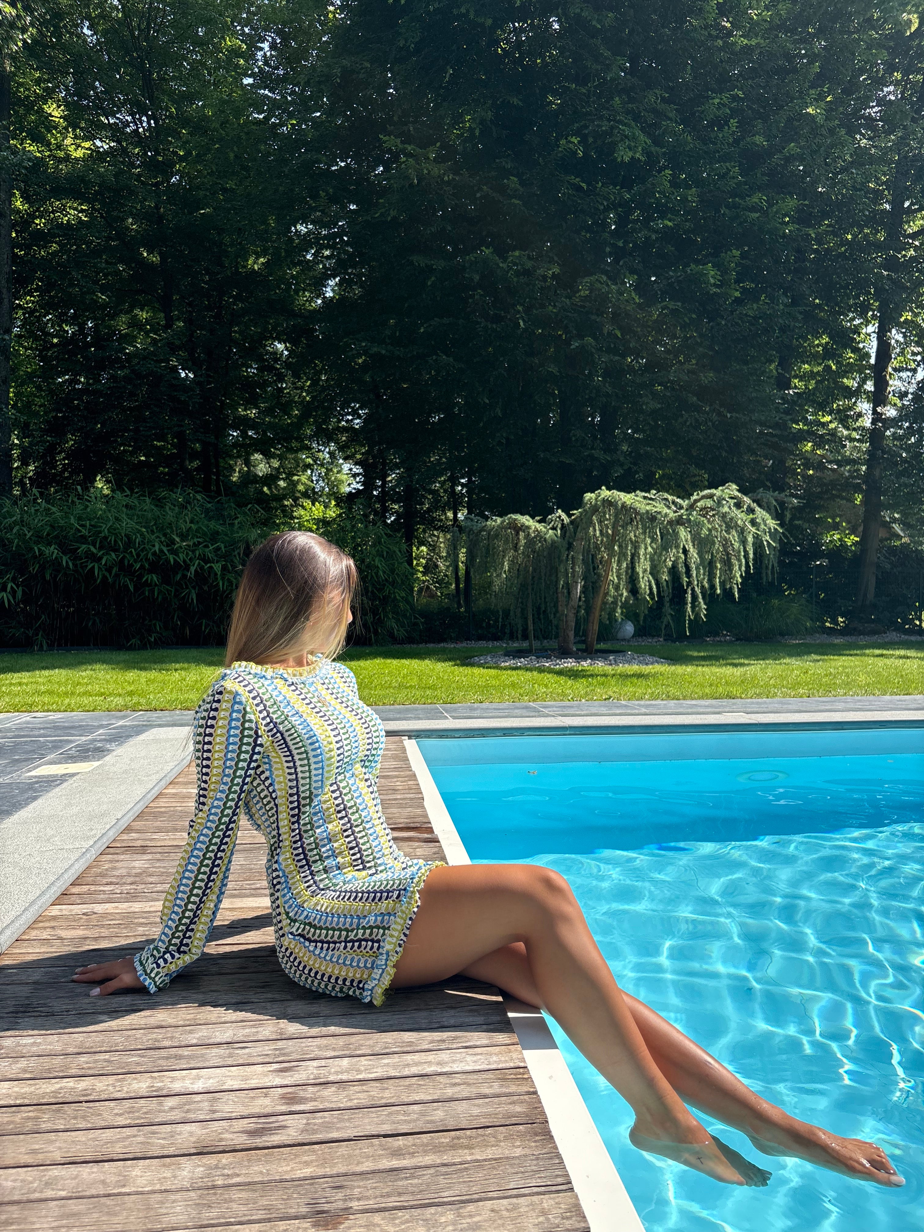 Robe Rosalia ajustée dans les tons vert, bleu et blanc, manches longues. Fermeture discrète à l’arrière pour un enfilage facile.