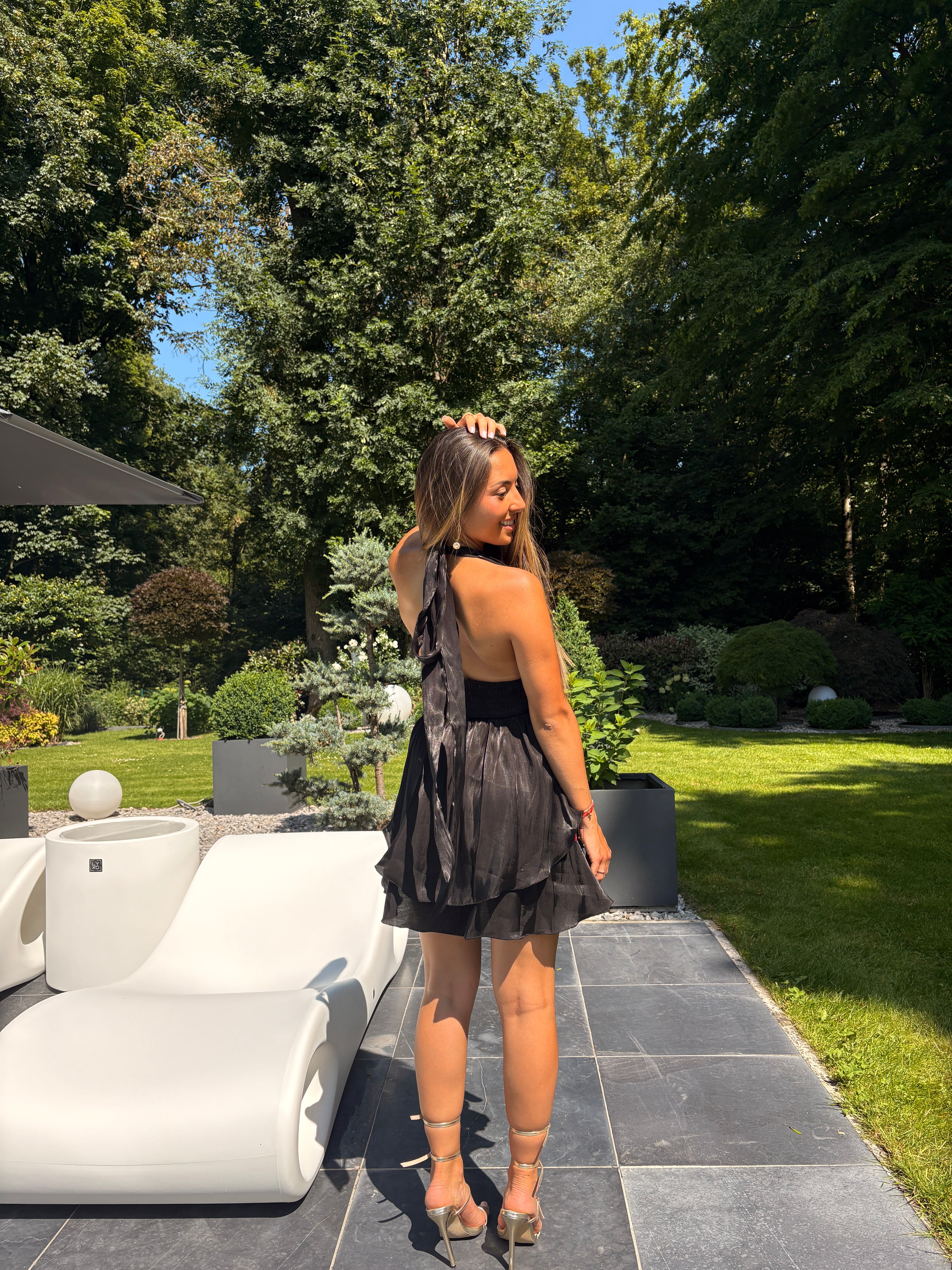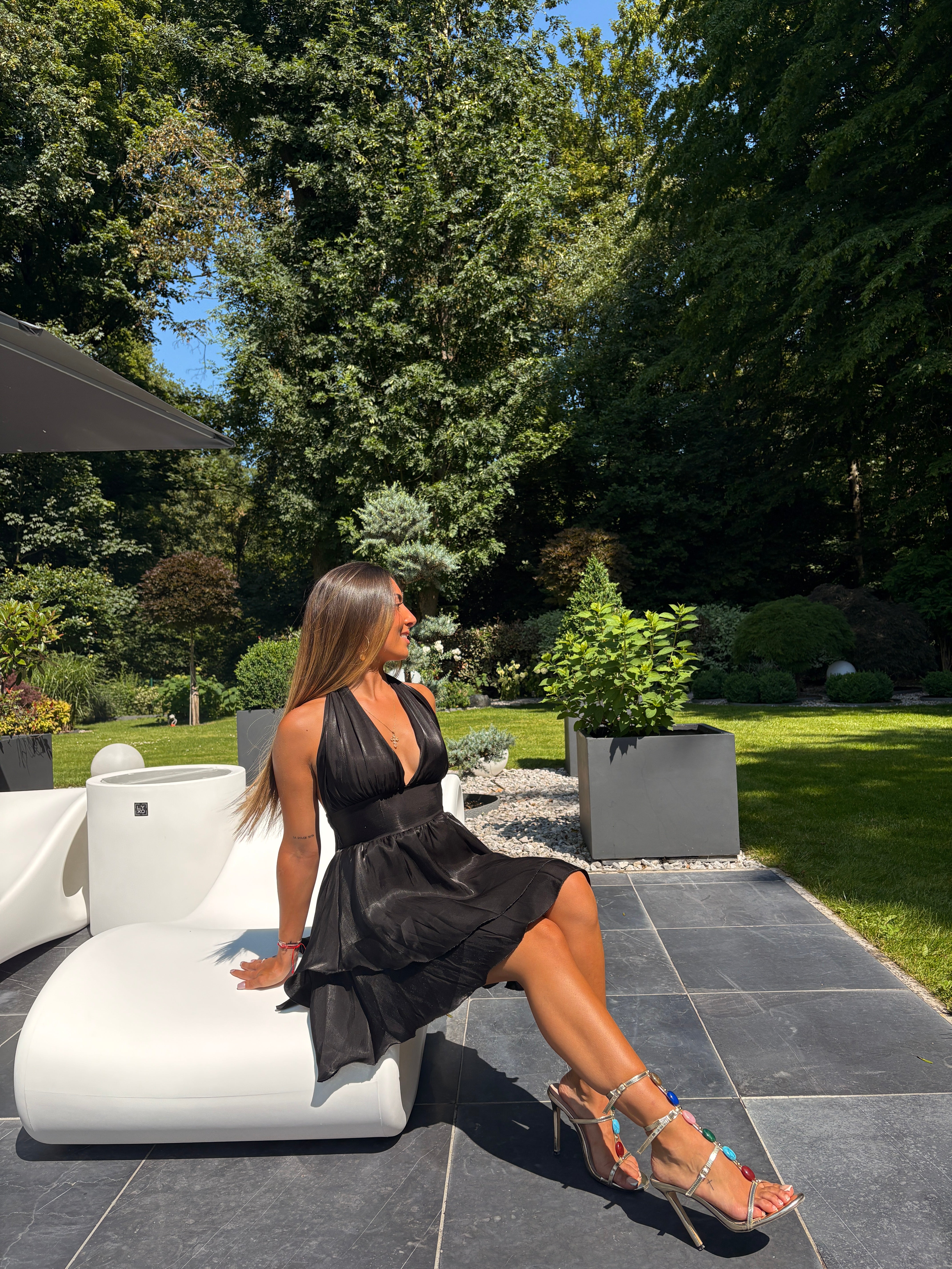 Robe Serena, fluide au fini satiné, dotée d’un décolleté plongeant et d’une taille marquée pour sublimer la silhouette. 75%...