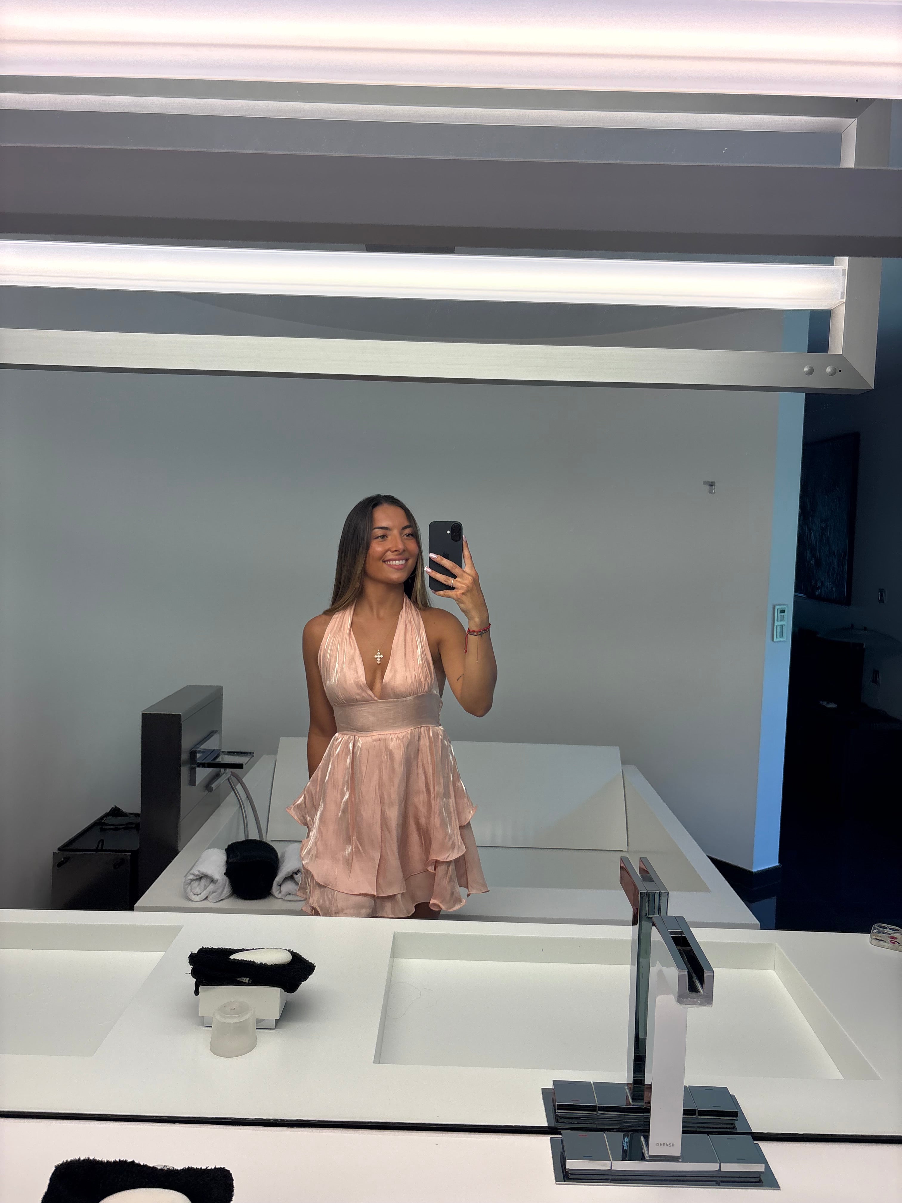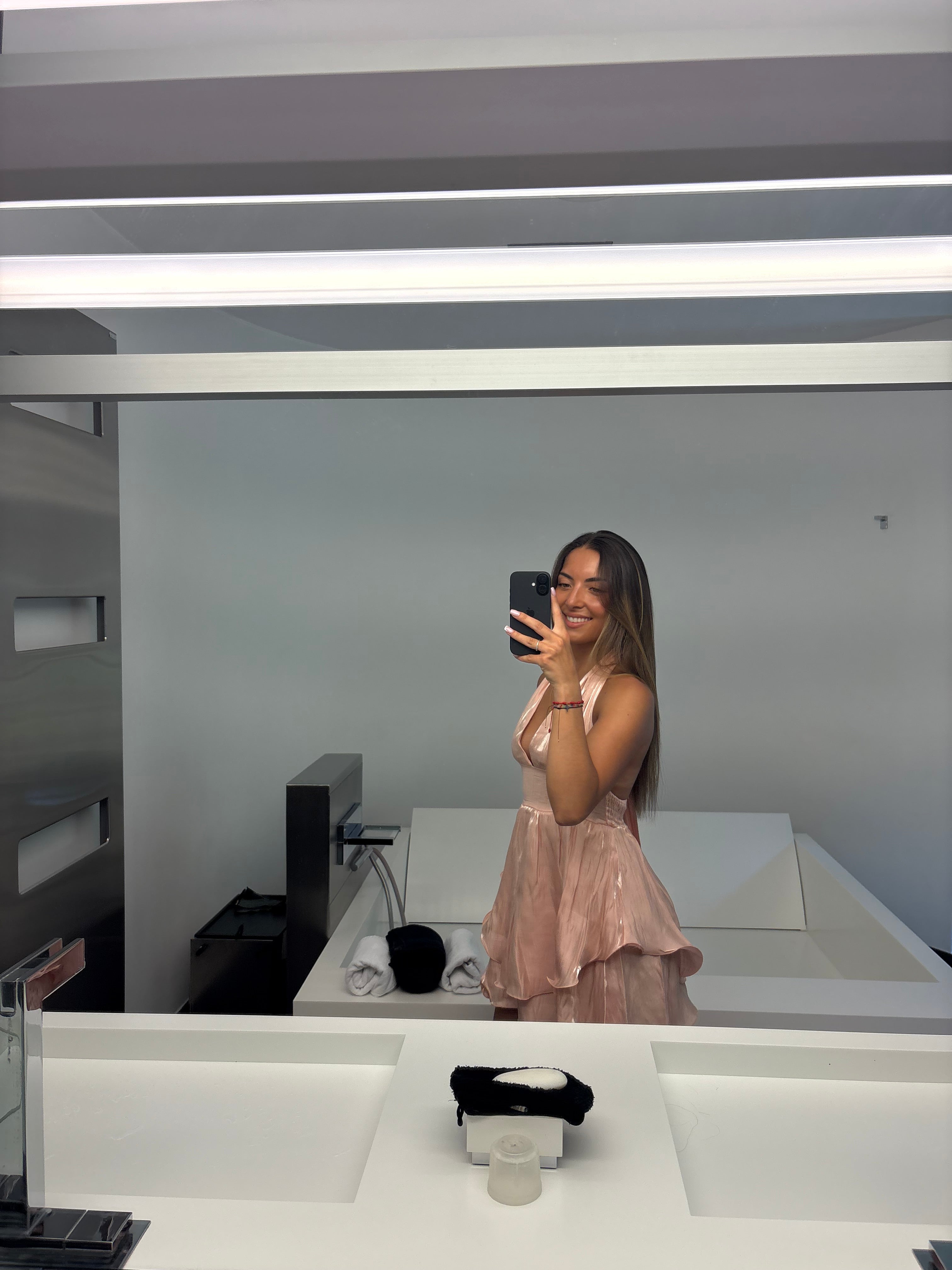 Robe Serena, fluide au fini satiné, dotée d’un décolleté plongeant et d’une taille marquée pour sublimer la silhouette. 75% viscose...